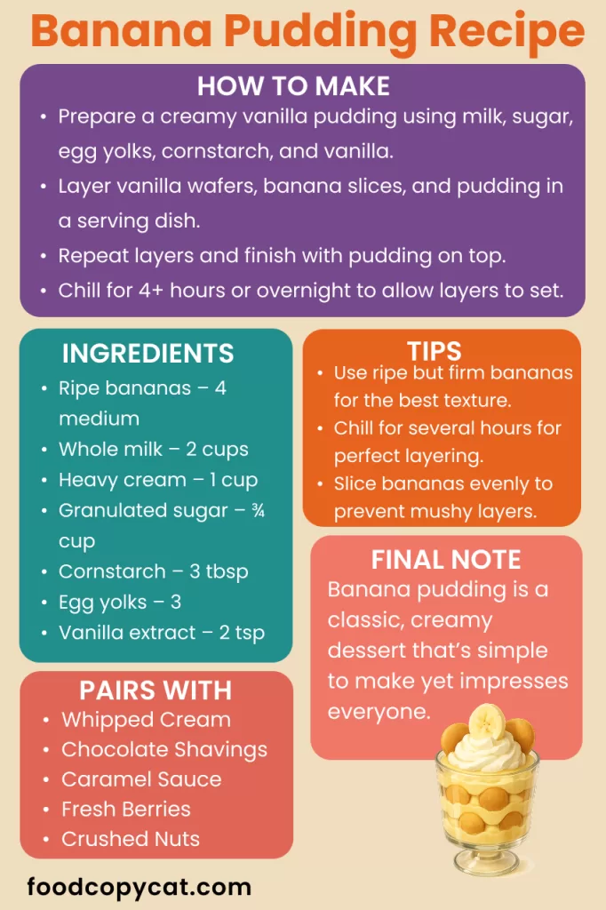 By following the detailed steps, thoughtful tips, and ingredient substitutions, you can customize the dessert without compromising flavor or texture. Perfect for family dinners, celebrations, or quiet evenings, banana pudding remains a timeless favorite. Once chilled and served, it delivers a smooth, rich experience that keeps everyone coming back for more, making it a must-have recipe in any home kitchen.